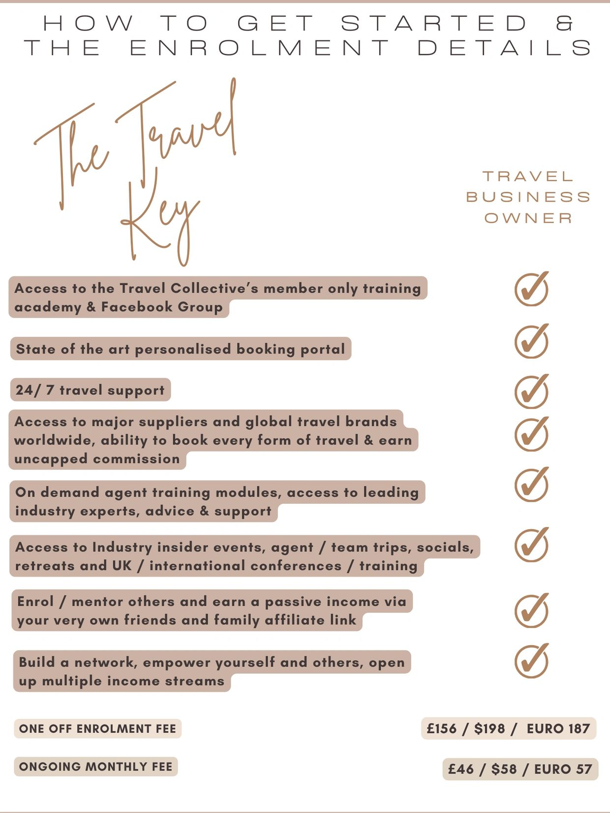 You will then pay £46 a month (this starts the month after you enrol) which covers everything you will ever need - much like any other subscription you may have, there are no additional hidden fees at all. Your Insurance, friends and family referral link, travel booking system, website, customer support, supplier access, trainings - it is all included.